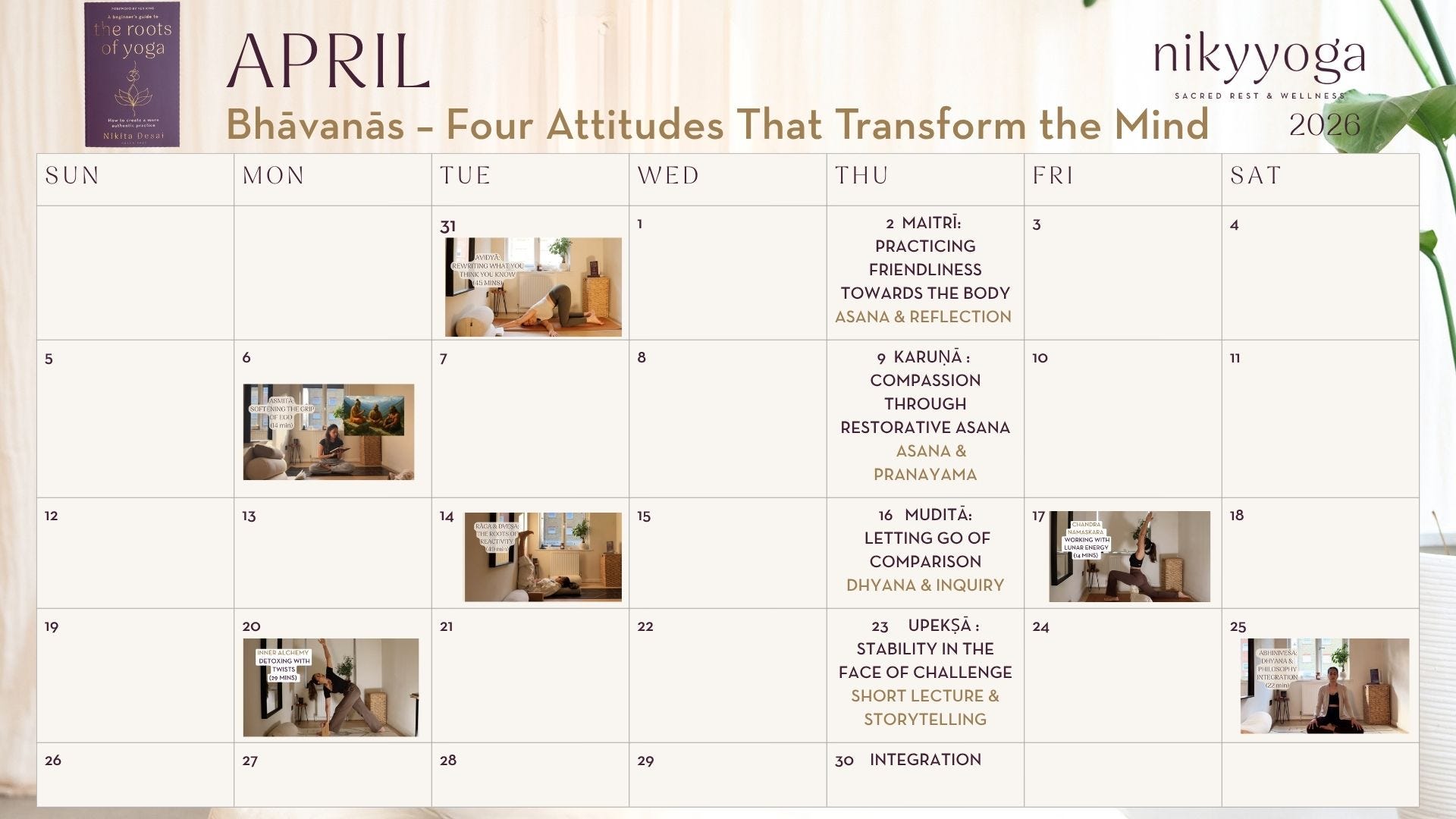 This month’s theme is the four Bhavanas or attitudes. These are laid out by Sage Patanjali in the Yoga Sutras (1:3) and are also known as the keys to mental peace.